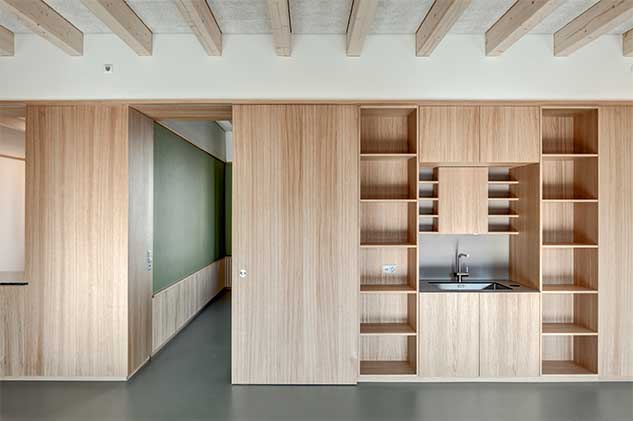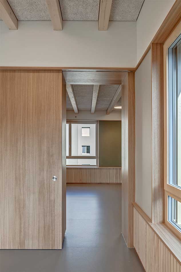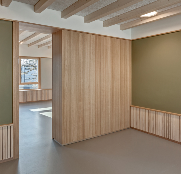 Die Horteinheiten sind auf zwei Geschossen angeordnet. Die beiden Gruppen sind über den Windfang und das Treppenhaus unabhängig voneinander zu erreichen. Der Mitarbeiterraum schliesst direkt an den Windfang an und ist für externe Besucher einfach aufzufinden. Die Garderobe bildet einen dem jeweiligen Hort angegliederten Vorraum und kann mit Schiebeelementen abgetrennt werden.