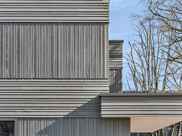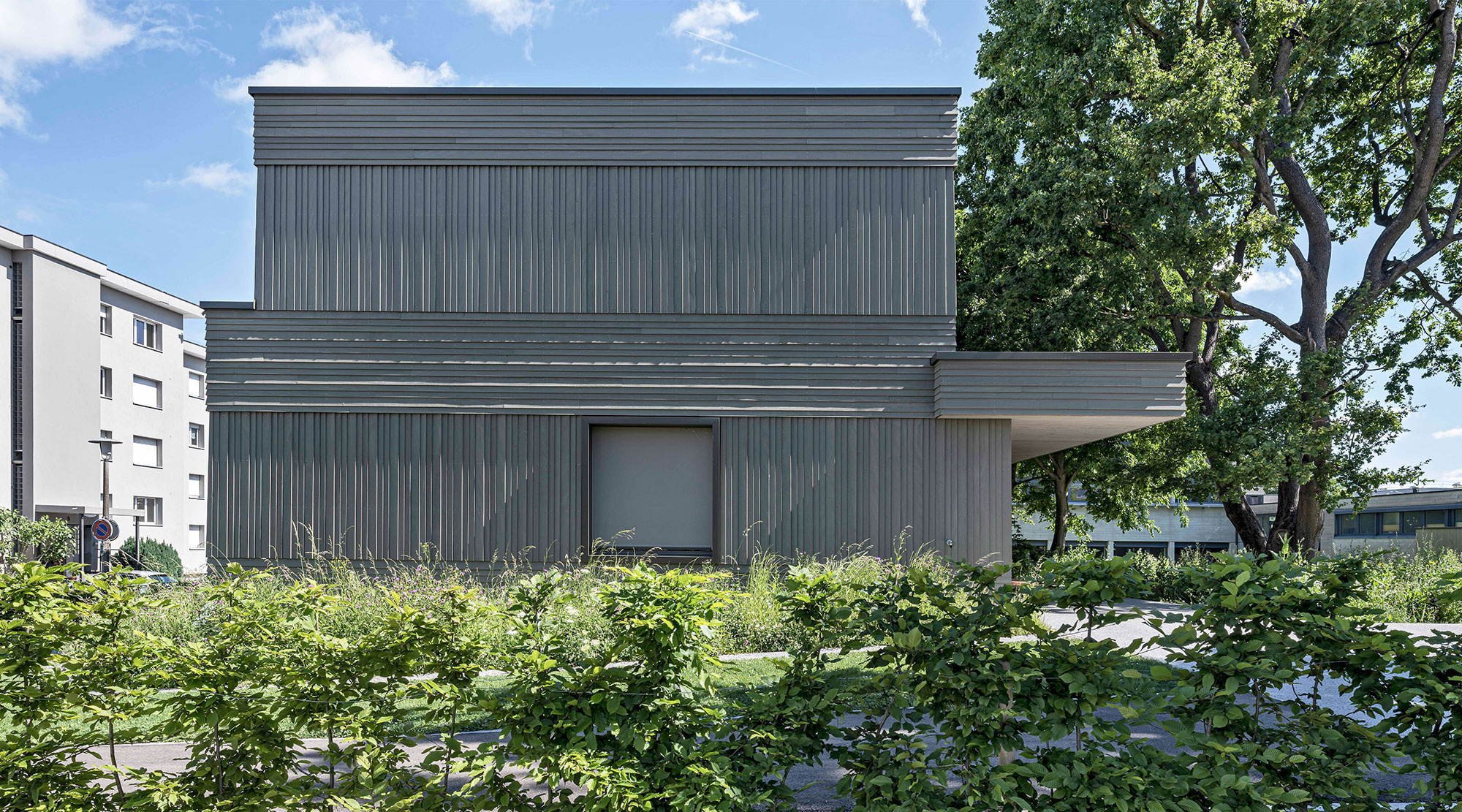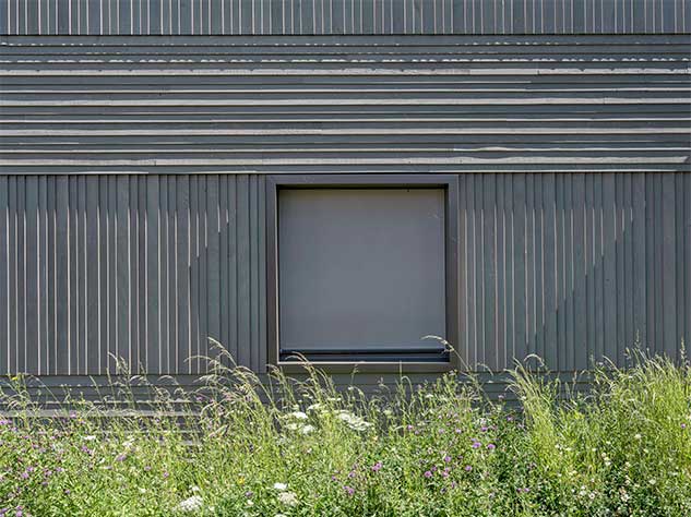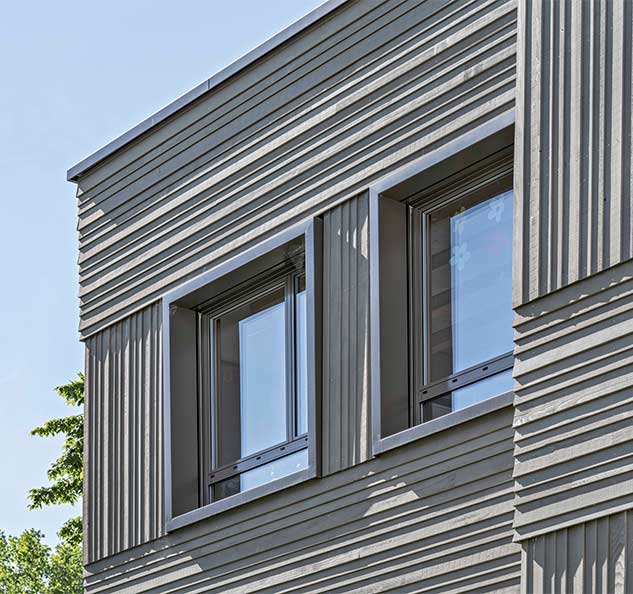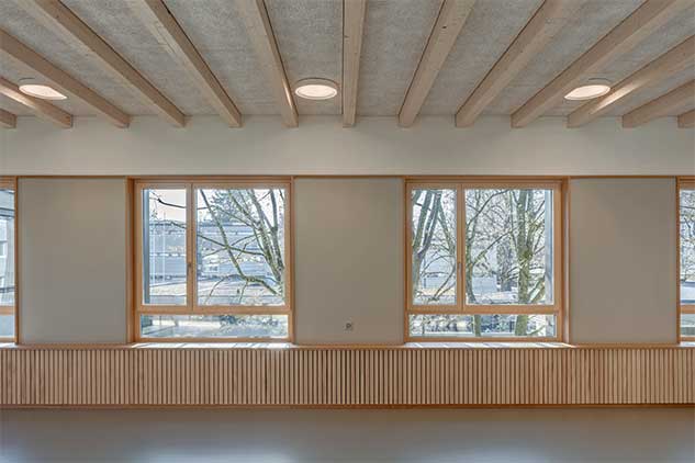 Die Materialisierung der Fassaden orientiert sich an den bestehenden Schulhauserweiterungen. Eine abwechselnd horizontale und vertikale Stülpschalung gliedert und belebt das Erscheinungsbild. Farblich wird der Neubau in die bestehende Anlage integriert.