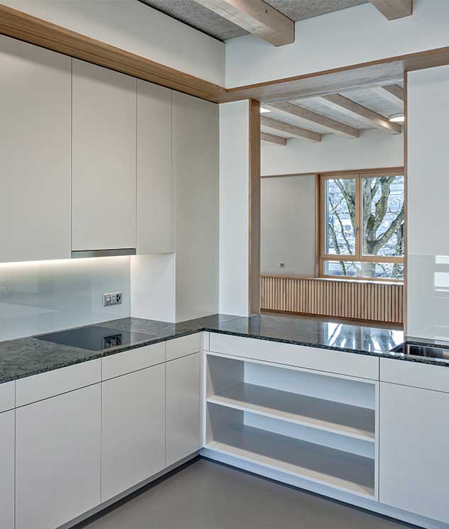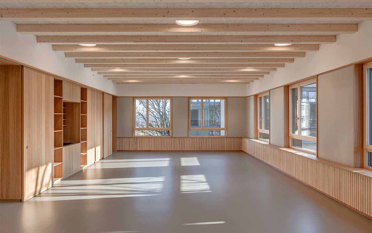Das kompakte Hortgebäude ist als reiner Holzbau ohne Unterkellerung konzipiert. Eine angemessene Befensterung sowie vertikale Stoffstoren schützen das Haus vor Überhitzung. Eine schwere Trockenschüttung als Unterlagsboden sorgt für die Ableitung der Wärmeeinstrahlung.